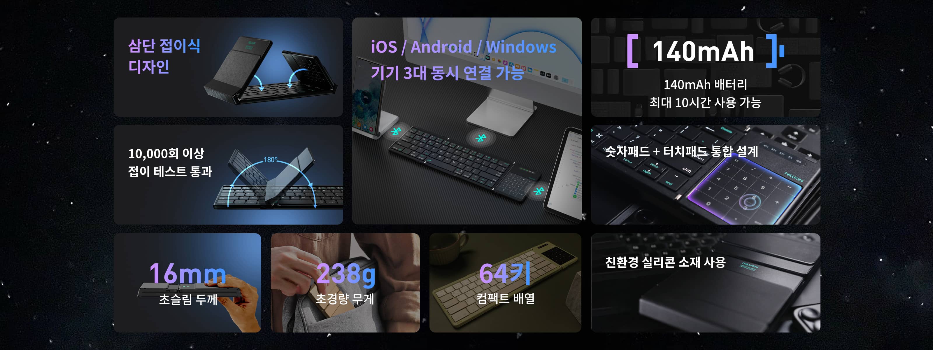 140mAh की बैटरी के साथ, आपको एक बार चार्ज करने पर 10 घंटे तक टाइपिंग का समय मिलता है। साथ ही, यह 10 मिनट की निष्क्रियता के बाद ऑटो-स्लीप हो जाता है—पावर बचाने के लिए पर्याप्त स्मार्ट, आपके काम के साथ तालमेल बिठाने के लिए पर्याप्त स्थिर।