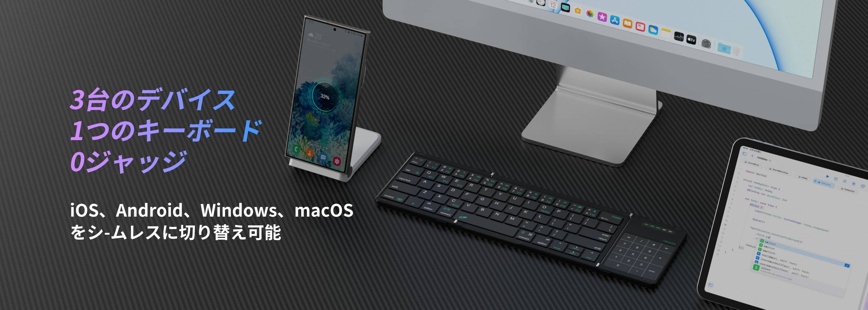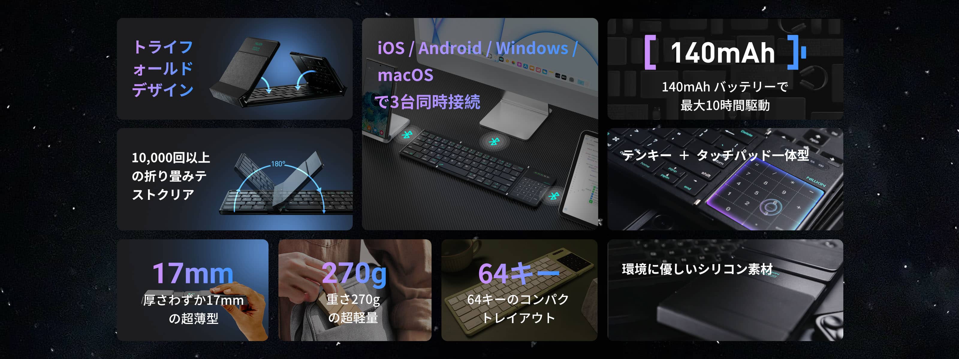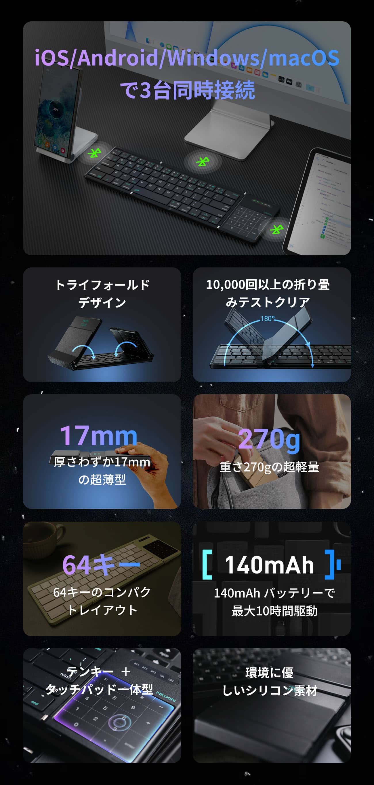 フルサイズのキーボードに展開し、ポケットサイズの忍者のように折りたためます(わずか270g—月曜日のToDoリストより軽い)。