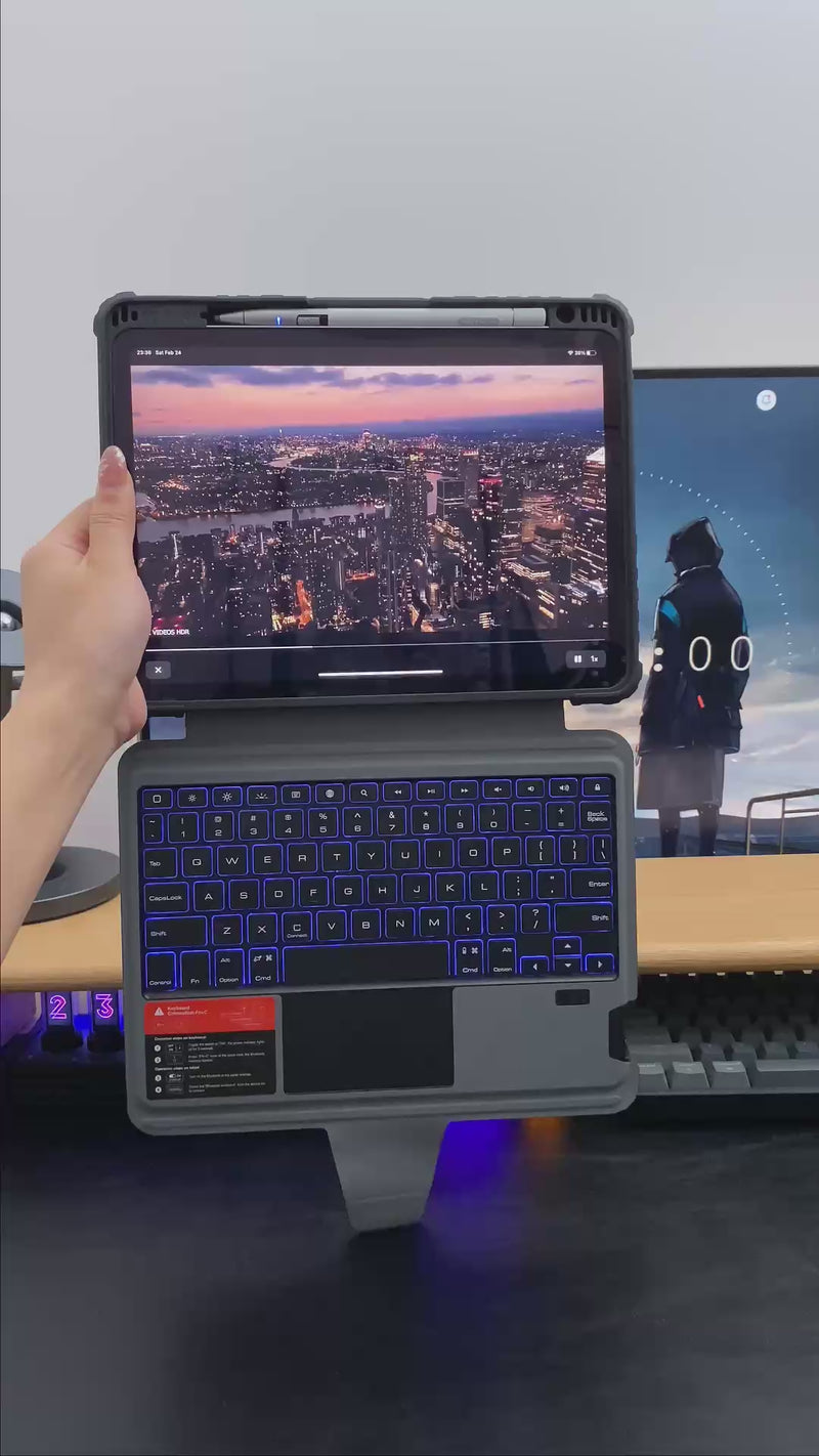 The case features a rechargeable backlit keyboard with 7 colors and 4 brightness levels, allowing you to easily use your iPad even in a dark environment. The key is quiet and comfortable for typing, and the built-in highly sensitive trackpad enables smooth scrolling, swiping, and more. With the Anti-Mistouch Technology trackpad, bid farewell to cursor distractions while typing.
